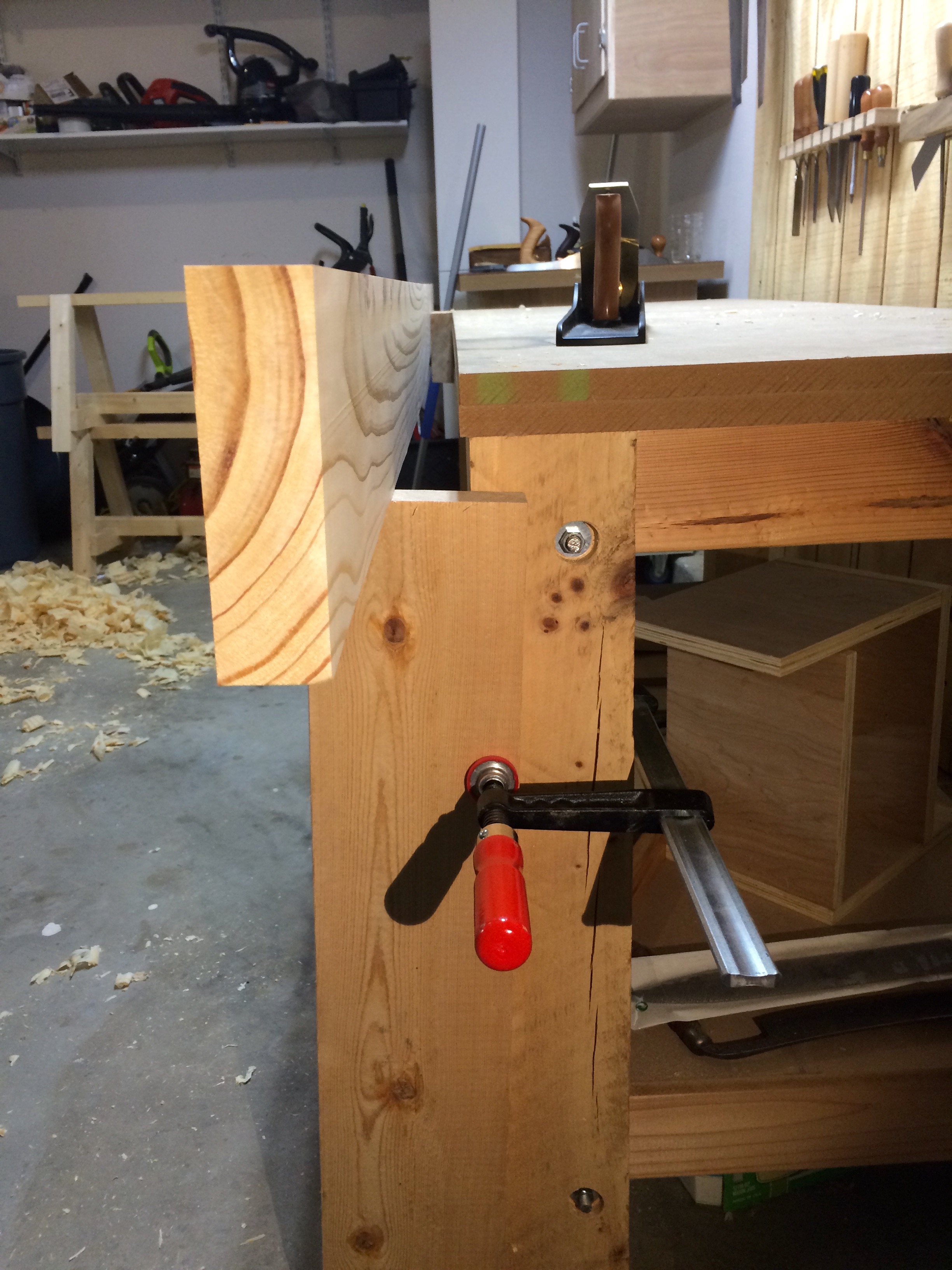 My current workbench couldn’t support the long boards for edge jointing. I worked around this by cutting a scrap board to the approximate height of my vise and clamping that to the opposite leg. This allowed the other end of the board a place to rest.