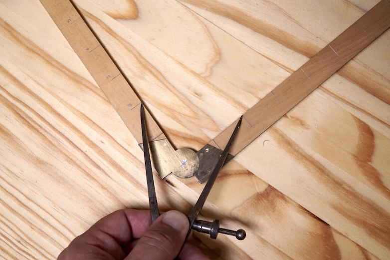 To make the sector, start by marking the center point of your hinge, where the inside of each arm intersect.  I used an accurate straightedge to carry a line through with a pencil.  It’s critical that this is accurate.