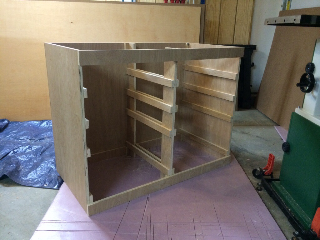 The first thing I did was cut most of my parts.  It’s critical that the sides, back, and face frames are dead square.  After the parts are cut, I glue and nail my doublers to the inside of the sides.  I mark the sides to identify the inside left and right.  It’s important to get the doublers level and parallel to one another, because this is where your drawer slides will mount.
