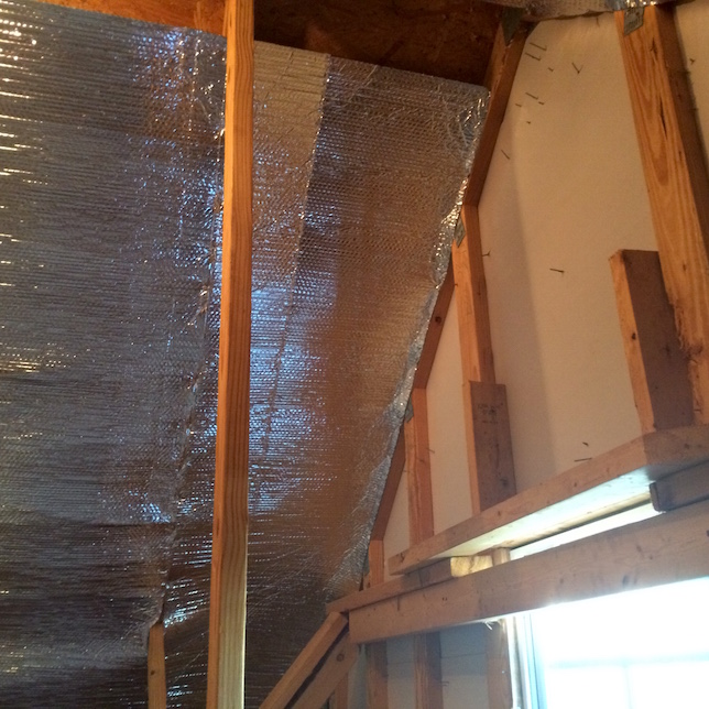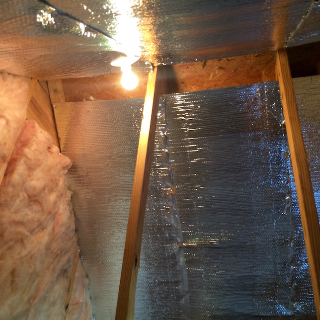 Installation of the radiant barrier is straight forward. It’s sold in various widths that correspond to common spacing of your rafters. You simple staple it between two rafters, every 6 inches or so. The instructions said to leave a 3-6 inch gap at the top if you have a ridge-line vent.